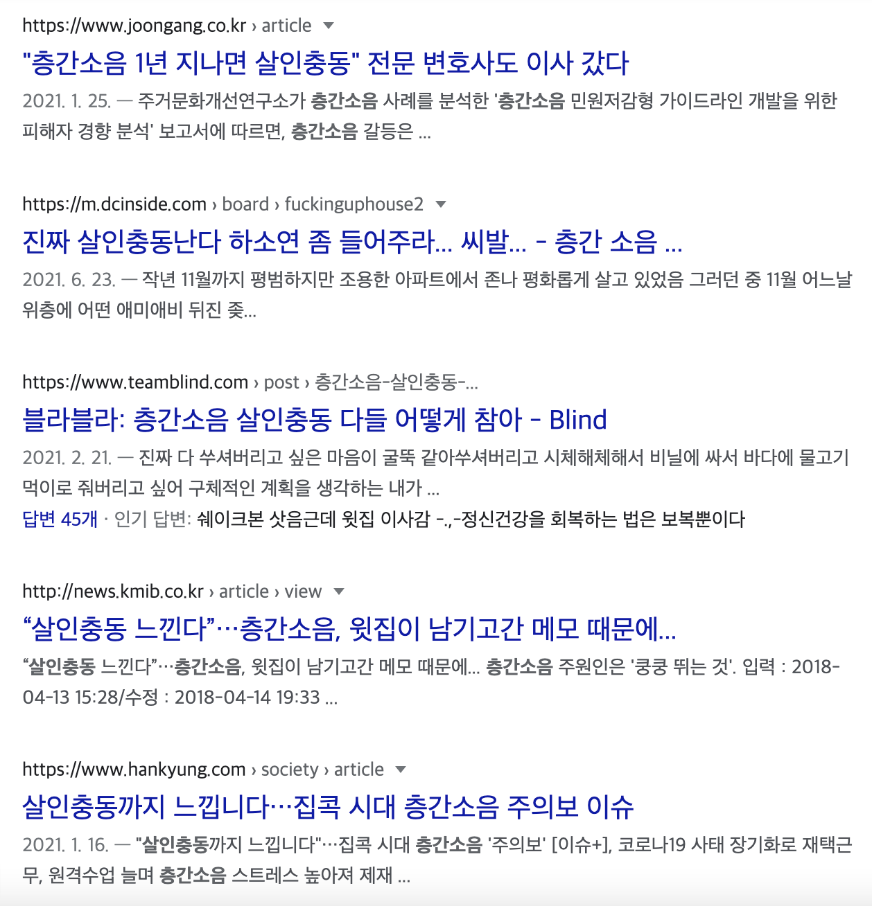 요즘 어이가 없는 게 층간소음 심했다고 하면 살인을 해도 인정할 거 같은 분위기가 종종 느껴진다. 층간소음이 그렇게 괴로우면 신고를 하든가 민원을 넣든가 건설사를 고소하든가 정신과를 가시라고요; 어떻게 윗집 사람을 해코지한다가 해결책이 되는 거야. 사람이 살면 소리야 당연히 나는 거고 아파트 천장이 얇으면 소리가 울리는 건 어쩔 수 없는데 그걸 자기한테 일부러 피해를 주려고 하는 행동이라고 생각하니 더 참기 힘들어 하는 거 같다. 이것도 피해의식의 일종일 듯.